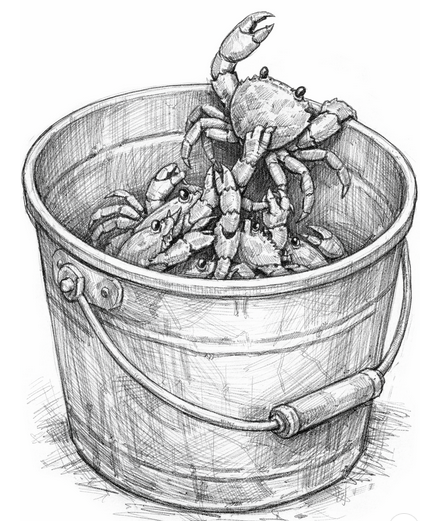 اگر چند خرچنگ را در یک سطل قرار دهید و یکی از آنها سعی کند از سطل بالا برود، بقیه آن را به پایین میکشند. هیچکدام از آنها فرار نمیکنند زیرا مدام جلوی یکدیگر را میگیرند. اگر فقط یک خرچنگ وجود داشته باشد، میتواند به راحتی از سطل بیرون بیاید و تعالی نماید. با این حال، وقتی تعداد زیادی خرچنگ وجود دارد، اتفاق عجیبی میافتد. هر بار که یک خرچنگ سعی میکند به سمت آزادی و تعالی بالا برود، خرچنگهای دیگر پاهایش را میگیرند و او را به پایین میکشند. در نهایت، هیچکس فرار نمیکند و همه آنها در سطل موجود میمیرند.