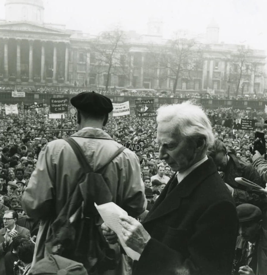 وێنە: بێرتراند ڕەسێل خۆی ئامادە ئەکات، وتاری دژی چەکی ناوەکی بخوێنێتەوە. مەیدانی ترافالگار، ۱۹٦۱