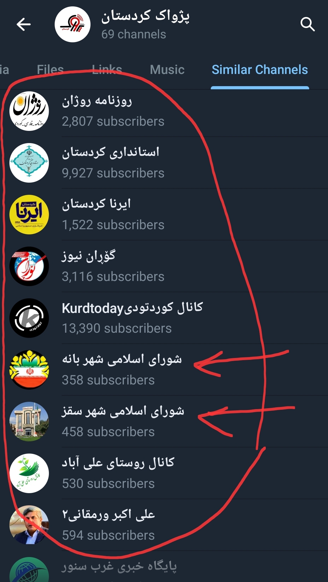 (کوردتودی، استانداری کردستان، ایرنا کردستان، گۆڕان نیوز، شورای اسلامی شهر بانه، شورای اسلامی شهر سقز، پایگاه خبری غرب سنور، روزنامه روژان (همان که پرستوی فرستاده برای آقای جوانمردی در آن کار میکرد)، خبرگزاری تسنیم کردستان. جمعیت هلال احمر شهرستان بانه، فرمانداری مریوان، دفتر امام جمعه پاوه(قادری)، رامیاری، رضا امیدوارتجریشی، شبکه کردستان، مکریان امروز، اخبار کردستان، فرمانداری شهرستان بوکان، زن روز، افشاگری، ارومیه خبر، بانه پیام، شاری مەریوان، دکترسارا فلاحی، مەریوان هەواڵ، میراث آریا (سلطنت طلب!)، اصلاحات نیوز، مرصاد، ایران ما، پایگاه خبری انتخاب(کانال اصلی)، ڕووداوی شار(کپی رووداو)، ورزش خانێ، ماموستا عادل عزت، خبرفوری جنگ اسرائیل، اموات مریوان (با ٥١ هزار عضو احتمالا جهت جلوگیری از درز نام کشتەشدگان) و حتی کانالی انگلیسی زبان جهت طرفداران ایلان ماسک به نام DOGS Community، و بسیاری دیگر کانال که در ویدئوی پیوست میباشد).